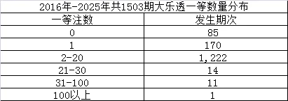 大乐透过去十年,一等奖空开85次,一等奖只有一注的次数发生了255期。2-20注的次数同样是最高的,有1222次,20注以上只有26次。