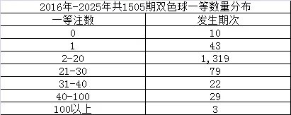 双色球空开一等奖发生10次,只出现1注一等发生43次,大约为3.5%。出现2-20注一等奖的次数最恐怖,高达1319次。出现20注以上一等奖发生了133次。