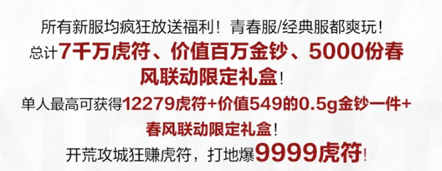 只要你在一个指定服务器注册角色,就有机会参与7000万虎符瓜分计划;首次攻占5级以上地块还有可能触发隐藏彩蛋,最高能暴击9999虎符。赛季结束之后,留在榜单上的玩家还能拿到金钞和限定周边。