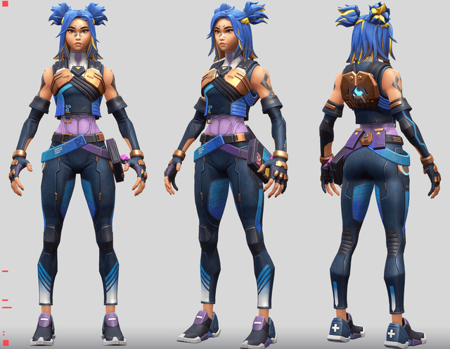 游戏里的英雄设计同样遵循了“为玩法服务”这一理念。每个角色有且只有一两种主题色,在这个基础上,人物的服装、技能、饰品等元素都会紧紧扣着主题色来设计。比如,霓虹的主题色是深蓝,斯凯是草绿,奇乐则是黄色和绿色混搭。这种设计既强化了角色形象,也增加了对局便利度。玩家可以用分辨颜色这种简单有效的方式区分不同的英雄,剔除对局中不必要的干扰。