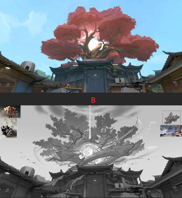 以瓦手独有的国风地图“古寨”为例,攻方和守方被设计师用冷暖色调的方式区分开来,攻守两边的墙壁绘画也有所不同。为了保持色调的一致性,不让地图元素干扰正常的游戏进程,设计师组还对取材地的屋檐样式进行了化用,舍弃看起来有些突兀的白色,选用和地图整体风格契合度较高的绿色。