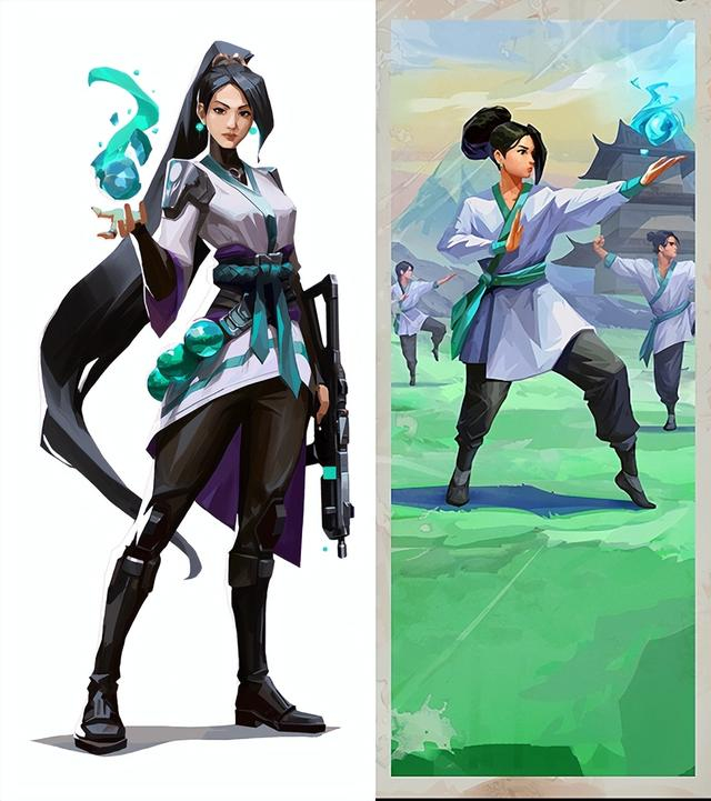 具体到设计细节方面,我们可以以陕西妹子“贤者”魏玲莹为例,拆解一下设计师在创造角色时的小巧思。在背景设定中,贤者曾于道观里静修多年,因此她的服饰自然要从道家练功服中汲取灵感。不过,传统练功服下摆较长,不利于实战机动,所以设计师将其改良为短裙样式,既保留了东方气韵,又贴合了战术需求。