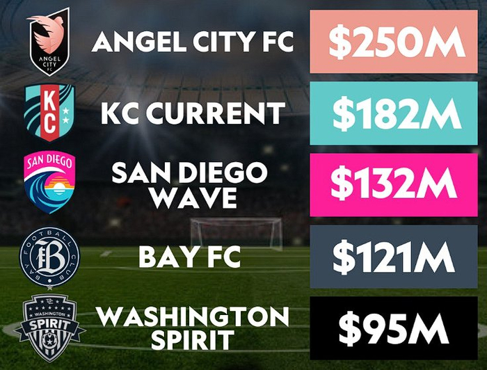 从2012年创立以来,NWSL已经成长为世界最大的联赛之一:3年2.4亿美元的版权费,较上个周期增长40倍;2024年,整个联盟的赞助额增长超过98%;联盟内球队估值极速上升,去年圣迭戈海浪队、西雅图君主队和洛杉矶天使队的易主,直接创造了两位数的投资回报率。其中,洛杉矶天使估值达到了2.5亿美元,较2020年增长了124倍 。