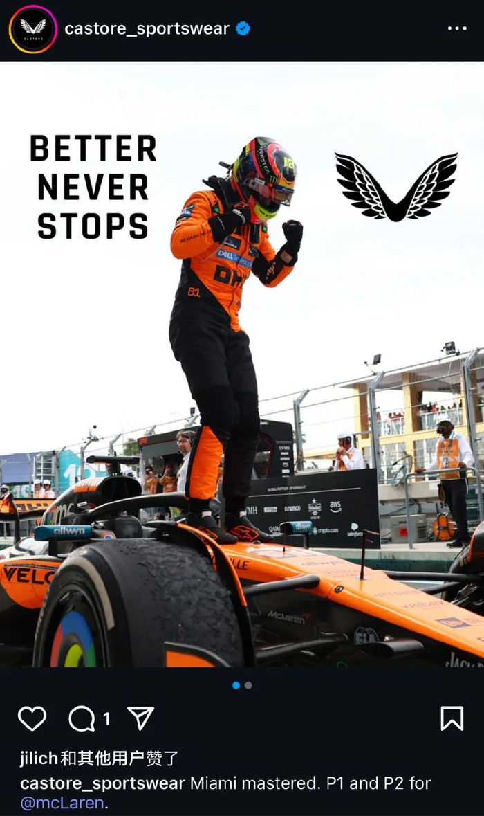当2024赛季F1落幕,迈凯伦时隔26年再次捧起车队冠军奖杯,Castore作为相当重要的服装合作伙伴,却仅仅在ins上发了两组图片便再无后续,缺乏对赛场高光时刻的深度挖掘与联动。