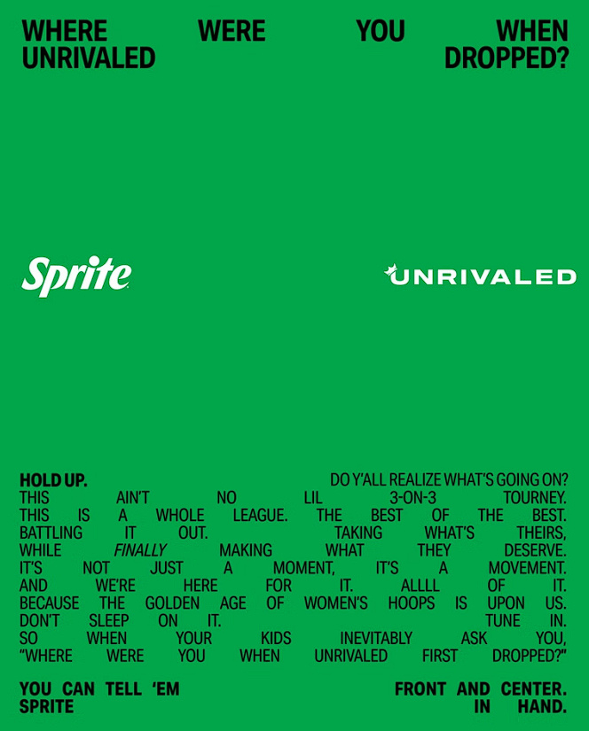 今年1月,雪碧成为了历史上首个女子3X3全场制篮球赛Unrivaled(无敌联赛)的创始合作品牌之一。而他们的宣传物料也极具雪碧一贯大胆、有态度的风格:「在无敌联赛启动时,你在哪儿呢」?像是在喊话所有还在犹豫的品牌:不要等这个联赛红了再来上桌。