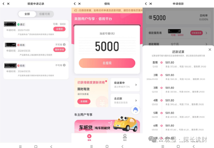 上述网友反映的情况属实吗?截至发稿前,探长读财在美图秀秀-借钱尝试申请借款发现,小编获得了5000元额度,根据借款页面披露的还款详情显示,借款5000元,分12期,每期还款501.80元。据此计算,美图借钱的综合年化利率依然高达36%。