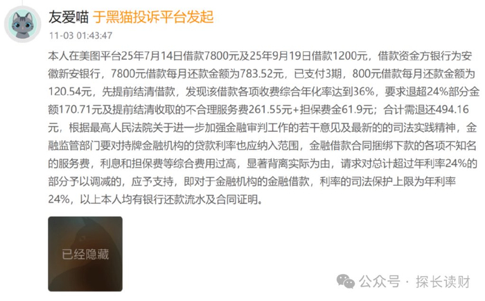 11月3日,有网友在黑猫投诉[下载黑猫投诉客户端](新浪旗下消费者服务平台)反映,其2025年7月14日、9月19日先后在美图平台借款7800元(每期还款783.52元)、1200元(每期还款120.71元),借款资方为安徽新安银行,提前结清借款发现,两笔借款各项收费综合年化费率近36%。