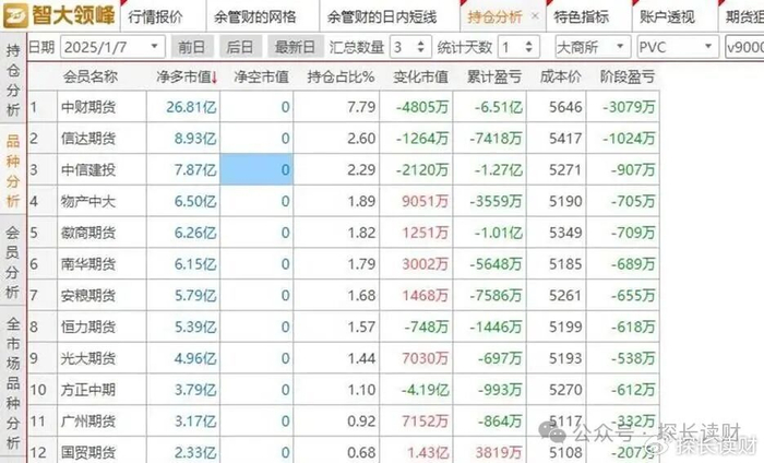 截至2025年1月初,中财期货仍然位居PVC多头持仓第一,持仓规模达26.81亿元,第三方平台显示其亏损额达6.5亿元。