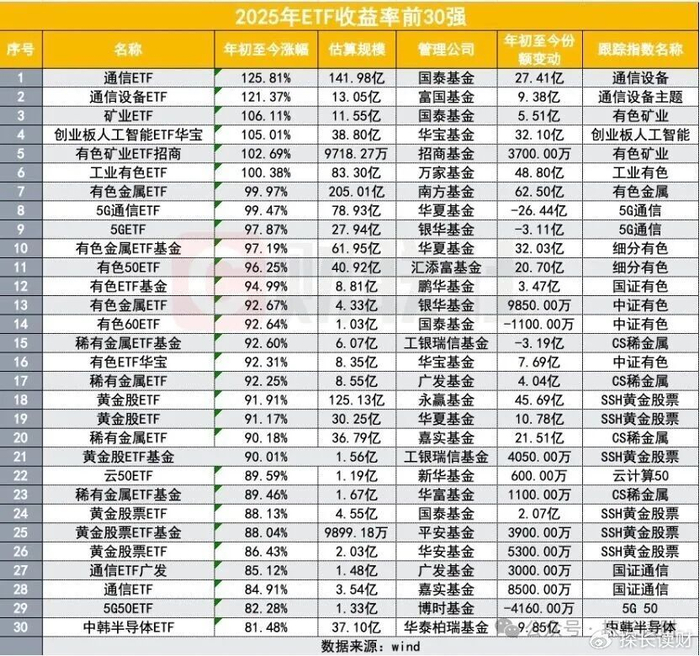 ETF市场规模从年初的3.73万亿元跃升至6.03万亿元,激增超2万亿元,已超越日本成为亚洲最大的ETF市场。国泰通信ETF以125.81%的年度涨幅拿下ETF冠军,富国通信设备ETF以121.37%的收益率获得亚军。