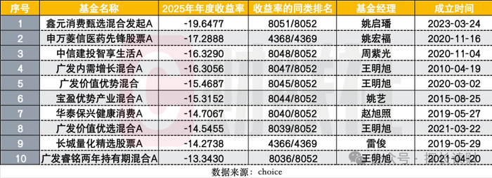 除了亏损王,2025年亏损榜上还出现了多位昔日“顶流”的身影。广发基金王明旭、交银施罗德韩威俊、景顺长城刘彦春等多位知名老将旗下均有产品上榜。