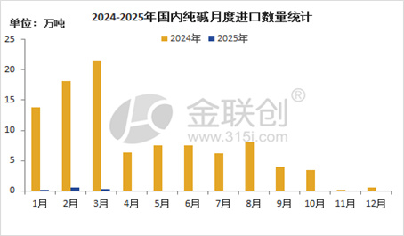 2025年来看,一季度进口纯碱总量在0.99万吨,约占国内总产量的0.10%,同比去年下降98.15%。4月份,中美之间贸易战升级,但对于纯碱进口影响不大,因为中国是全球纯碱最大的生产国和消费国,进口纯碱对填补国内供应缺口影响较小,且美国纯碱加征关税后价格不占优势,因此总体来说影响较为有限。