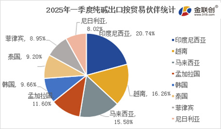 通过贸易伙伴统计,一季度国内纯碱出口排名前五名的主要贸易伙伴分别是印度尼西亚,约7.38万吨,占比20.74%;第二位的是越南,约5.79万吨,占比16.26%;第三位的是马来西亚,约5.55万吨,占比15.58%;第四位的是孟加拉国,约4.13万吨,占比11.60%;第五位的是韩国,约3.44万吨,占比9.66%。另外中国泰国、菲律宾、尼日利亚也有少量出口,其他出口贸易伙伴进口中国纯碱占比较小。从上图可以看出,进口国内纯碱占比较大的贸易伙伴多集中于东南亚以及非洲地区。4月份以来美国政府肆意滥用关税手段,对包括中国在内的全球贸易伙伴征收额外所谓“对等关税”,东南亚、东北亚等地区贸易伙伴或将选择进口运费便宜且关税低的中国纯碱,纯碱出口竞争力或于能够进一步提升。