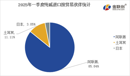 通过贸易伙伴统计,一季度国内纯碱进口排名前三名的主要贸易伙伴分别是阿联酋,约0.85万吨,占比85.84%;第二位的是土耳其,约0.11万吨,占比11.11%;第三位的是日本,约0.11万吨,占比3.05%,其他国家纯碱出口到中国占比较小,基本可忽略不计。