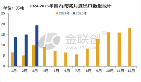 我国是世界上最大的纯碱生产国,国内市场自给率达90%以上。特别是2024年下半年以来,国内生产的纯碱在满足内需之后大量用于出口。从图中可以看出2024年7月份起,国内纯碱出口数量基本维持增长趋势。至2025年3月份,单月纯碱出口接近20万吨。