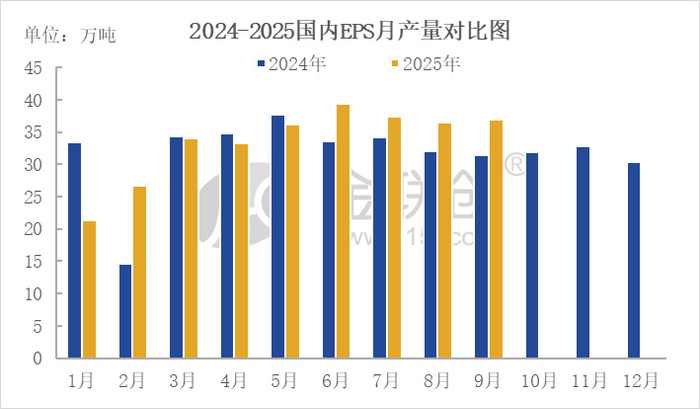 2025年9月,我国EPS产量约36.98万吨,环比增加0.47万吨,涨幅1.29%;同比增加5.58万吨,涨幅17.78%。同时,1-9月,国内EPS产量总计约301.80万吨,较去年同期提升5.44%。