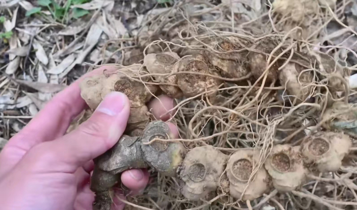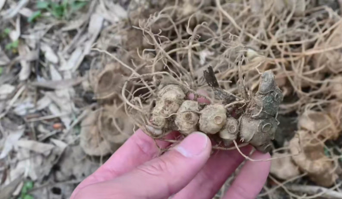 一般挖取这个黄精,挑选年份久块茎茁壮的,黄金年份不够或是比较瘦小的这种我们挖回来,可以直接扔在附近的竹林下面让它繁殖。到时候幼苗生长多年,野生资源才不会枯竭。