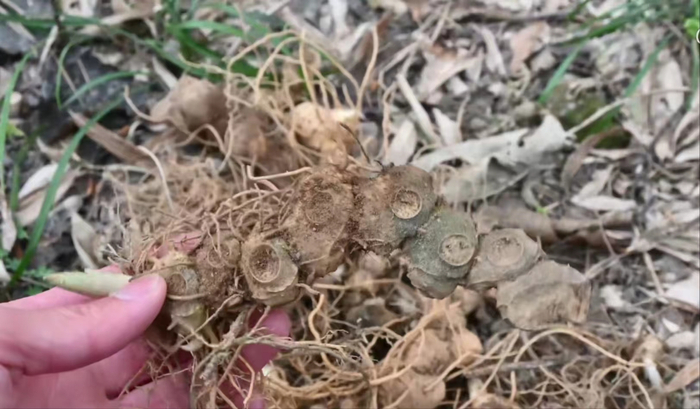 春天都要来了,竹林下面还是这么干,花几个小时,然后找了几棵这样子。还是很不错的黄精,根据它的干苗,我们挖取黄精的地下块茎,这个野生的黄精大家看一看。生长年份,每生长一个节,代表一年露出地表,它肉质就会受阳光的影响变成青色,完全埋在泥土当中,黄精的肉质是金黄色的。