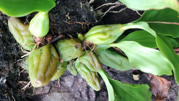我们来仔细的看一看它的样子,那个一个一个看起来绿绿的,像果实似的,其实是它的假鳞茎,就长在这个根状茎的上面,聚生在一起。