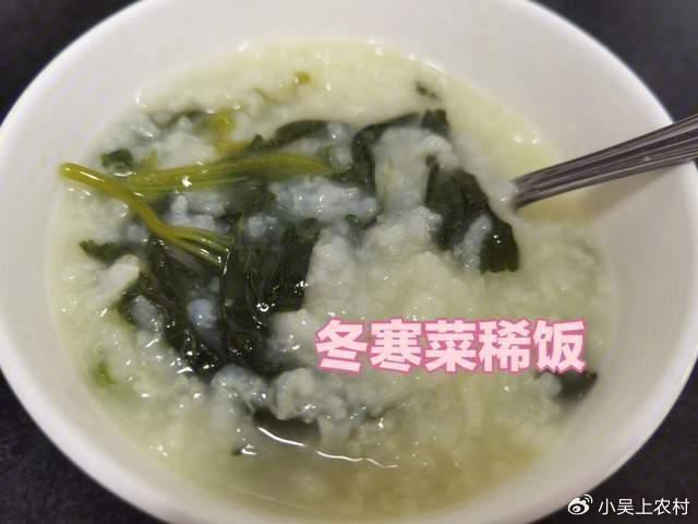 冬寒菜稀饭:将粳米、糯米淘洗干净,放入烧开水的锅内熬至稠糯熟;将冬寒菜洗净放入稀饭锅内,加少许猪油、味精和盐,煮制片刻即成。这种稀饭清香可口,特别适合解油腻。