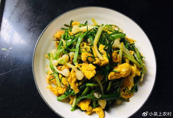 锅热加油,打入鸡蛋,煎至两面金黄,铲成片后打出,然后锅内加油,油热把小根蒜,辣椒,入锅内炒熟后,再把鸡蛋倒进锅内一起炒,加盐,调料就可以出锅了。香气袭人。