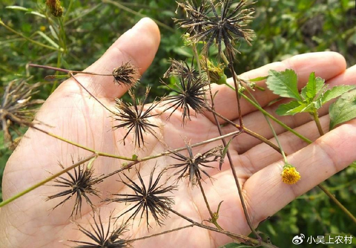 鬼针草,这种植物在广西农村路边特别的多,在这个冬春季节的时候,还有一些在开花,人从旁边经过,它的针刺就扎到裤脚上面,非常的讨厌。