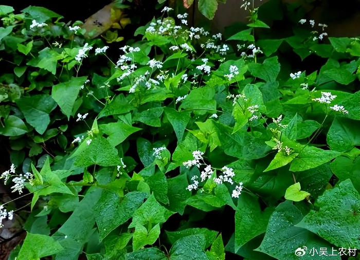 还有这种金荞麦的嫩茎叶,可以用来喂牛,喂猪等家畜,也是非常好的,用来当做饲料,像小吴的家乡菜园地旁边就长了一大片的金荞麦,每年长出来的嫩茎叶妈妈就会去割一些来喂猪喂牛,而且它割掉以后过不了多久,又可以长出来,一年甚至都可以长几次啊。