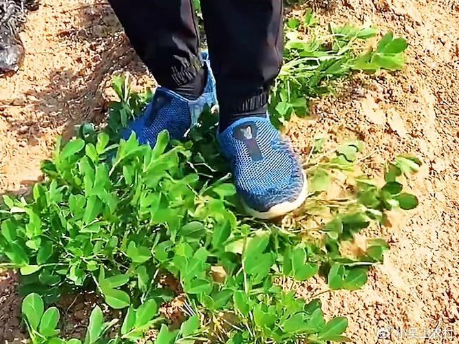 踩花生秧苗的力度也是有讲究的,不能随便踩。踩得太重了,就把花生秧苗踩坏了。