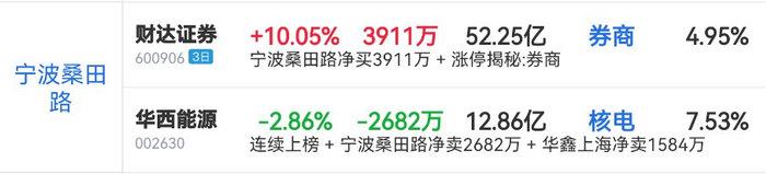 宁波桑田路:卖出华西能源2682万,买入财达证券3911万。
