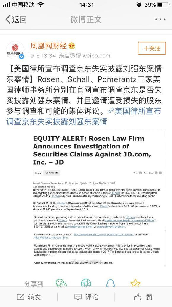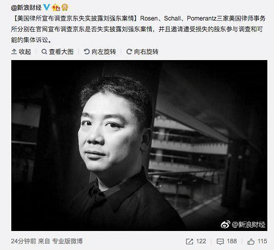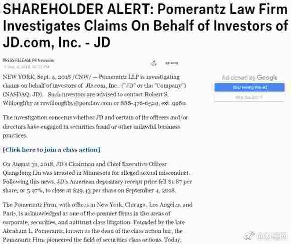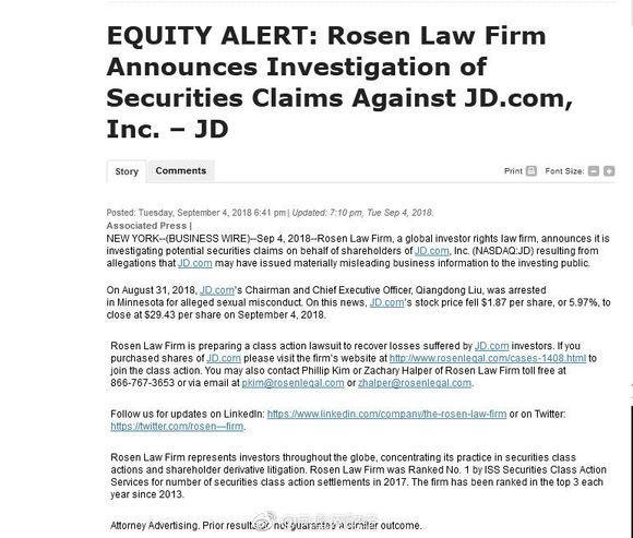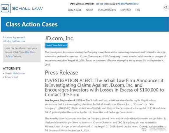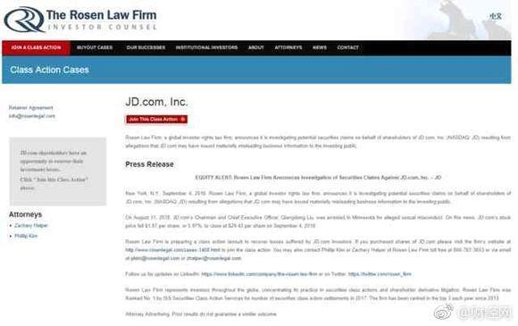 Rosen、Schall、Pomerantz三家美国律师事务所分别在官网宣布调查京东是否失实披露刘强东案情,并且邀请遭受损失的股东参与调查和可能的集体诉讼。在公告中,三家律所均提及上月31日,京东董事局主席刘强东一事,并认为此事造成京东昨日股价的下跌。