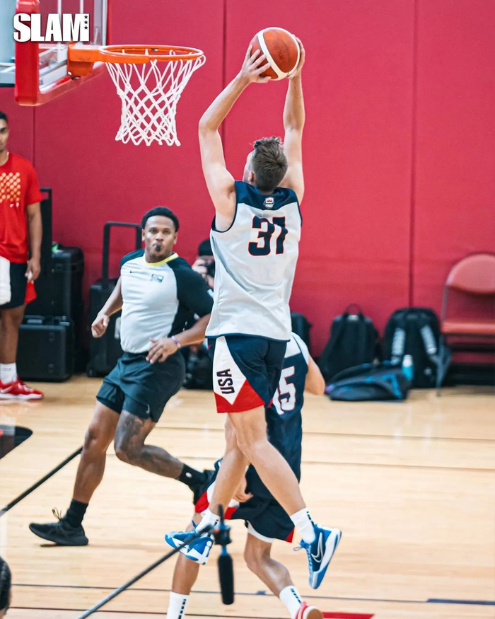 那个时候,他的身体素质已经能和诸多NBA球星相匹配,对抗完全不虚,拿到3次封盖和2次抢断。他在浓眉头上干拔三分,在阿德巴约头上完成补篮2+1,转换进攻双手暴扣,背打霍乐迪翻身跳投命中。