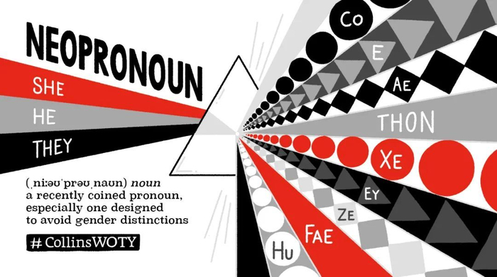 柯林斯词典还注意到,由于正在进行的关于性别以及变性人和非二元人代表的对话,新代词(neopronoun)的使用有所增加;它将该词定义为“最近创造的代词,特别是旨在避免性别区分的代词”。