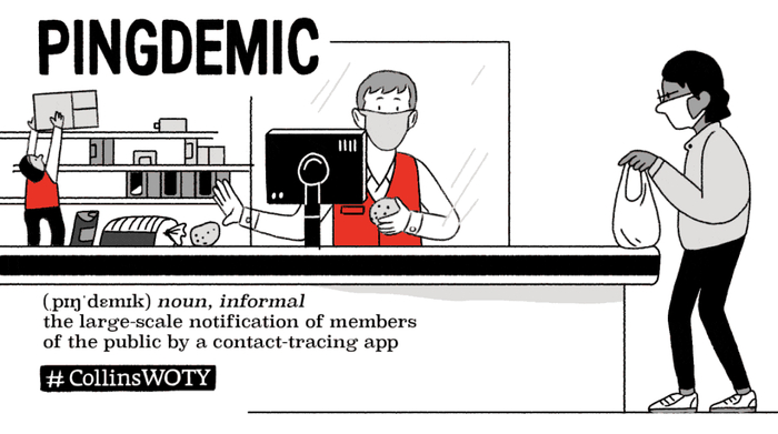 ping+pandemic构成的新词,指的是在手机上收到英国国民保健署(National Health Service,NHS)通过新冠肺炎检测与追踪(NHS COVID-19)App发来的自我隔离通知。