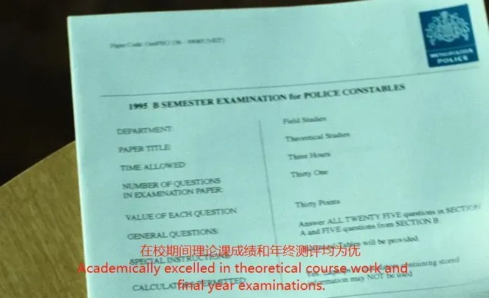 🎬电影《热血警探》(Blue Fury)中的台词提到:Academically excelled in theoretical course work and final year examinations. 在校期间理论课成绩和年终测评均为优,