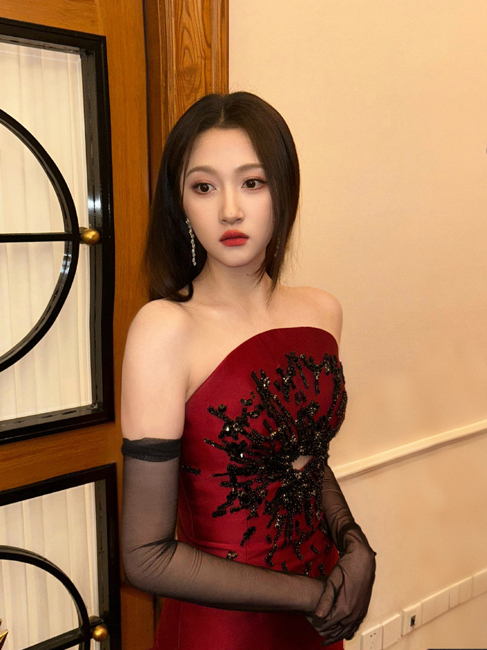 关晓彤红毯造型花絮图,抹胸红裙高定造型优雅复古,状态特别好@关晓彤