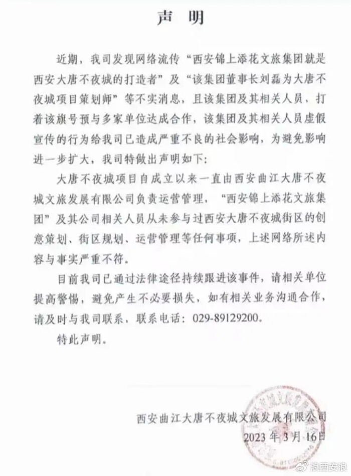 不过,据西安曲江大唐不夜城文旅发展有限公司的声明明确显示,西安锦上添花文旅集团及其相关人员从未参与过西安大唐不夜城街区的创意策划、街区规划、运营管理等任何事项。