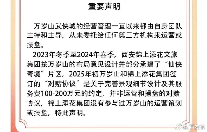 在万岁山武侠城声明中,明确否认协议另一方西安锦上添花文旅集团(以下简称“锦上添花文旅”)是项目的运营和操盘手,而且,2025年的“对赌”金额只是景观设计和服务费100-200万元。