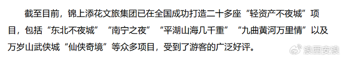 和这一次高调宣传“11亿对赌”事件类似的是,锦上添花文旅之前就宣扬自己是大唐不夜城模式的打造者和策划者,并且在全国各地景区复制不夜城模式。