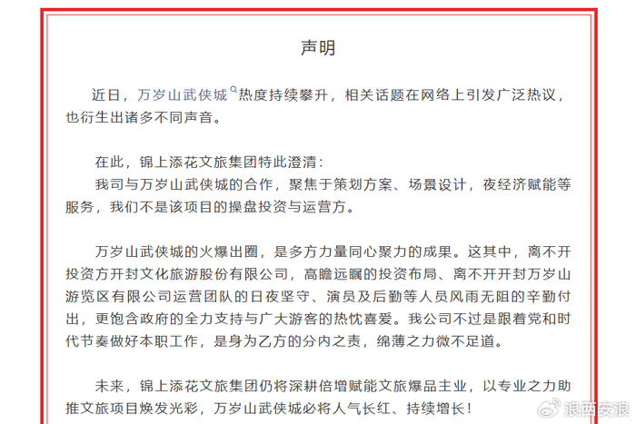 而在万岁山武侠城声明公布的稍早前,锦上添花文旅也通过发布声明否认了自己是万岁山武侠城的实际操盘者。