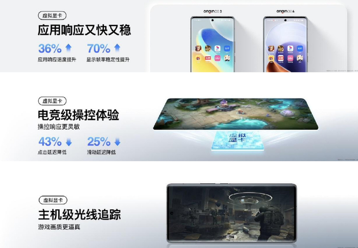 先来看OriginOS 4系统,这是蓝厂基于Android14深度定制优化而来,同时在底层内核加入了新技术架构,全球首款推出“虚拟显示”功能,属于对安卓动效绘制流程进行重构。有了这项功能以后,当用户在打开和退出应用时系统响应几乎零延时,响应速度提升36%、显示帧率稳定性提升70%,同时提供光追、插帧和超分技术。