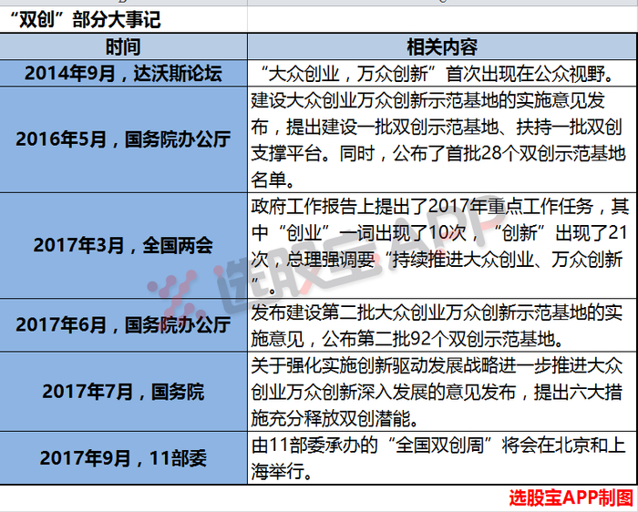 这句话在2014年由总理在达沃斯论坛上提出以来,就立刻受到了市场的关注。而选股宝APP梳理发现,这几年,国家有关“双创”的政策一直都在加速落地。