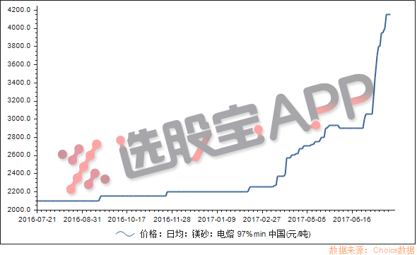 因为供需紧张,4月份镁砂涨价这个事件就爆发了,当时市场上开始备货抢货。镁耐火材料价格一直上涨。选股宝APP查询Choice数据显示,电熔镁砂价格正是在4月份左右开始大幅拉涨,4月份起突破2400元/吨,6月之前在 3000元/吨左右,而目前,价格已经站上4000元/吨。
