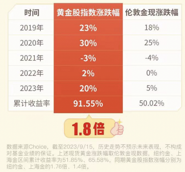 而如果把2020-2023这几个黑天鹅频出的年份算进去,看2019-2023年黄金价格的表现,就更可怕了,五年收益率高达50%,黄金股指数更是高达91.55%。
