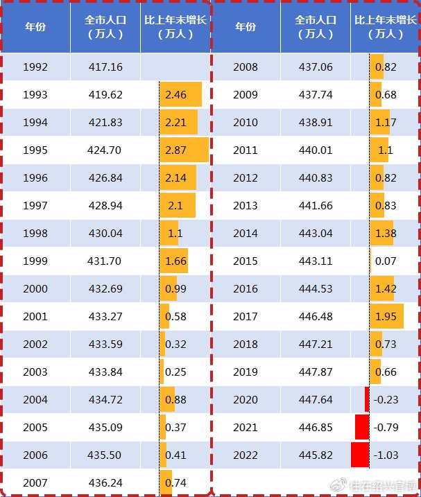 刚刚,2023年全国最新人口数据出炉!总人口140967万人,比上年末减少208万人;全年出生人口902万人,比原本预期要稍好一些;60岁以上人口占比21.1%,65岁以上人口占比15.4%,代表中国已进入中度老龄化社会。人口变化,对社会各层面都会产生深刻影响。那绍兴的人口情况如何?(*数据来源:2023年绍兴统计年鉴)1.人口三年负增长,降幅还在加大2022年年末绍兴总户籍人口445.82万人,比上年末减少1.03万人。下图是1992年以来,绍兴每年的人口和人口变动情况。