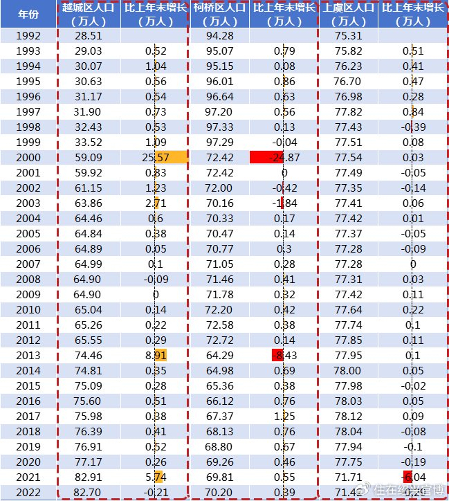可以看到,绍兴人口增长一直不快,1997年以后每年增长人口都不足2万人。在2013年全国放开二胎后,人口增速有逐渐上升的趋势。但随后疫情来临,2020年开始人口直接变为负增长,一直持续至今,且降幅还在不断扩大。2.越城区“吸血”三区下图是1992年以来,绍兴三区的人口和人口变动情况。