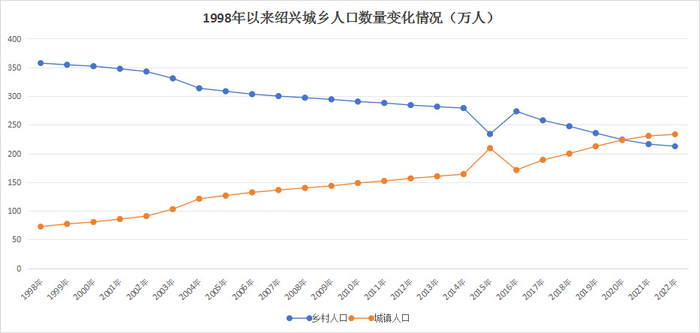 在我们传统印象中,绍兴好像是人口流出型城市,但事实并非如此。其实从2007年开始,绍兴的迁入人口一直是大于迁出人口的,是人口流入型城市。直到2019年开始,受疫情等方面影响,绍兴的人口迁入迁出量才开始变为平衡。到2022年,迁入人口又大于迁出人口。不过整体来看,迁入、迁出人口都在不断减少,人口流动性逐渐减弱。5.绍兴楼市,还有百万潜在需求下图是1998年全面房改以来,绍兴城镇人口、乡村人口的变动情况。