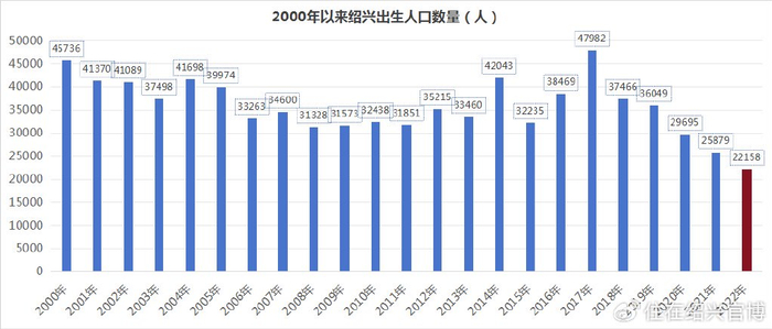 其中出现过3次明显的变化:①2000年,越城区增长25.57万人,柯桥区减少24.87万人。因为2000年,绍兴市经历了1992年撤扩并后所进行的最大的行政区划调整。原绍兴县的斗门镇(大部分)、东浦镇、鉴湖镇、皋埠镇、马山镇(不含撤扩并前的原马海乡)划归了绍兴市越城区管辖。②2013年,越城区增长8.91万人,柯桥区减少8.43万人。因为2013年,绍兴“撤县(市)设区”,将原绍兴县的孙端镇、陶堰镇、富盛镇划归越城区管辖。③2021年,越城区增长5.74万人,上虞区减少6.04万人。因为2021年,上虞区沥海街道的管辖区域划归绍兴市越城区。在这3次变化之后,越城区才成为了人口第一大区。因此就有人提出:“这难道不是越城区在吸其他两区的血吗?”3.出生人口新低,学区房最后出手时机绍兴历年出生人口,在2020年首次跌破3万人。到2022年,出生人口仅22158人,已经来到了历史最低点。