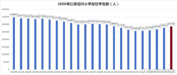 跟出生人口直接相关的,就是绍兴小学在校学生数。按照6周岁上小学,2020-2022年绍兴小学在校学生数,走势基本与2014-2016年出生人口相近,呈现每年上升趋势。