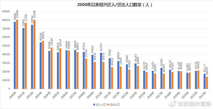 由此可知,2017-2019年还保持着的较高出生人数,将在2023-2025年入读小学,之后就读学生数就会逐年下降。也就是说,2025年之前,很可能就是学区房最后的出手时机。4.绍兴还是人口流入城市下图是2000年以来,绍兴历年户籍人口迁入/迁出情况。