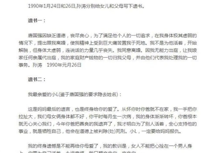 在孙涛的一封遗书中这样写道:“唐国强为了满足个人的一切追求,和我提出离婚,让我精神上受到了巨大的痛苦,置我于死地。”