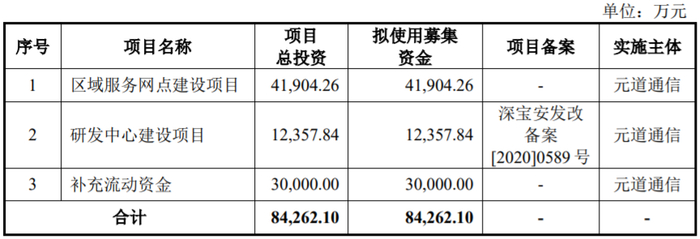 元道通信本次公开发行股票数量不超过3,040.00万股,社会公众股数量占本次发行后公司总股本的比例不低于25%,本次发行不涉及公司股东公开发售股份。本次发行拟募集资金8.4262亿元,募集资金在扣除发行费用后将投资于区域服务网点建设项目、研发中心建设项目和补充流动资金。